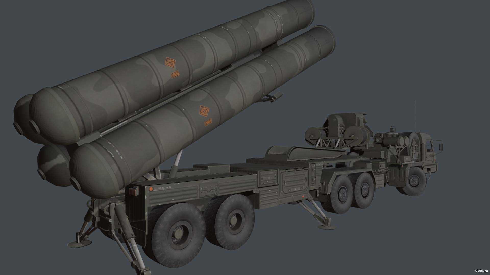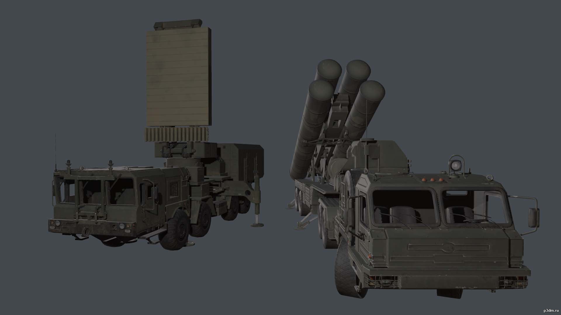 Набор моделей системы ПВО С-400 из World War 3. В архив входят: тягач БАЗ-64022, пусковая ракетная установка и всевысотный обнаружитель 96Л6. Пусковая установка и радар доступны в походном (сложенном) и боевом (развернутом) положениях.
