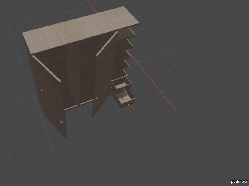 Модель имеет одну текстуру светлого дерева, отдельные полки, ящики, двери.